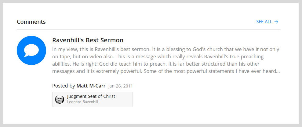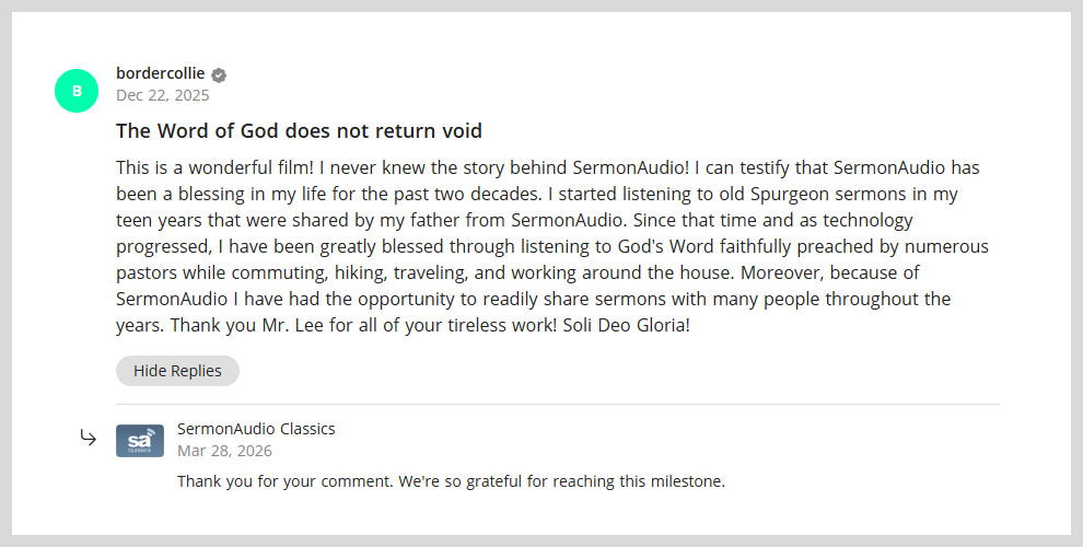 Finally, this change helps bring to the forefront those sermons that have been a genuine blessing to others. Through highlighted comments and thoughtful interaction, we trust it will help bring forward sermons that have been a blessing to others.